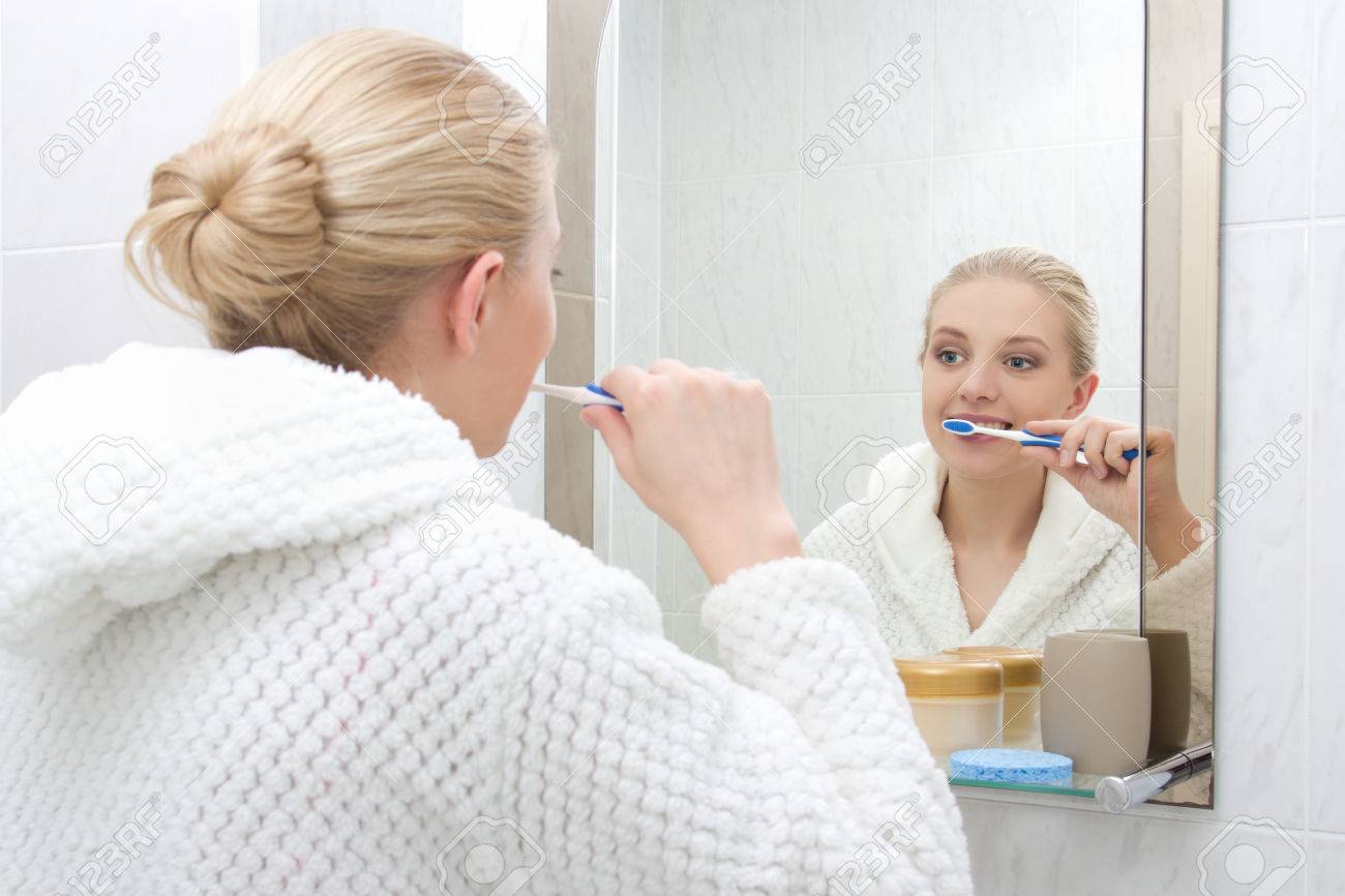 Young Beautiful Woman Brushing Teeth And Looking At Mirror In Bathroom Stock Photo Picture And Royalty Free Image Image 37824158